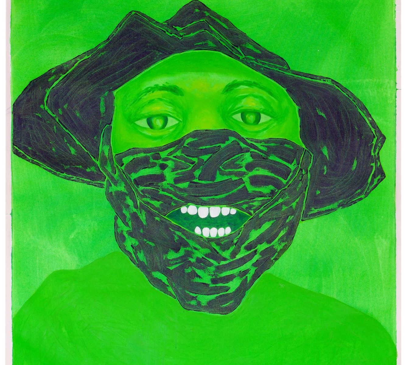 Phetogo’s signature use of black shoe polish to paint his figures against the green screen, as well as the googly eyes and exaggerated white teeth of their disturbing smiles, signal another troubling tradition of black representation, blackface. A work like Portrait of a blackbody as his Material Selfengages directly with blackface—yet disrupts its meaning given that the Motswana artist is interrogating the tradition from the space of the African continent. As Phetogo notes, minstrelsy as practiced in some countries in Africa did not carry a derogatory meaning. Black American minstrel artists came to Ghana and Nigeria in the 1920s, inspiring the Concert Parties form of theater. The rich web of references in Phetogo’s paintings thus both place him in dialogue with the tradition of questioning and reinventing the canon of Black representation, while affirming the multiplicity of black artists’ geographical, cultural, and subject positions and confronting viewers with their racist prejudices and histories.