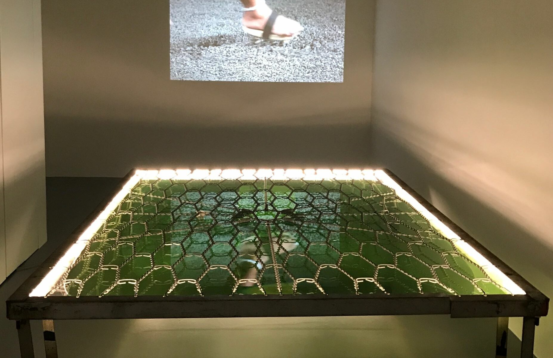 Installation view of Energies at the Swiss Institute, New York. Left: Liu Chuang, “Untitled (The Festival)” (2011), single-channel video (color, sound), 5:14 min.; right: Saba Khan, “Indus Water Machine (number 3)” (2020), console, headphones, fixed LCD TV, plastic hook, USB, MP3 player, glass cube with lid, and LED strip light (image courtesy the Swiss Institute)